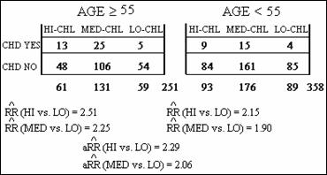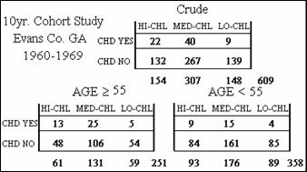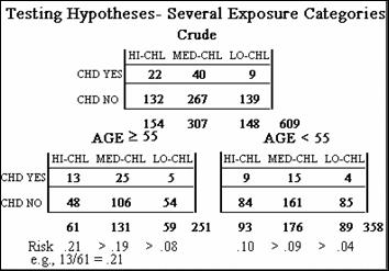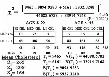 mean cholesterol in each exposure category, a chi square statistic that tests