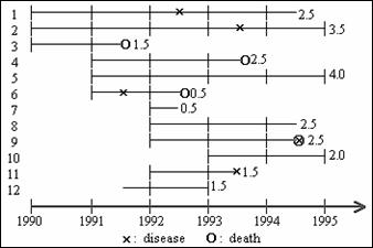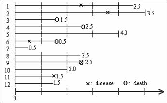 X denotes time subject diagnosed with the disease and a circle (O) denotes time of death that